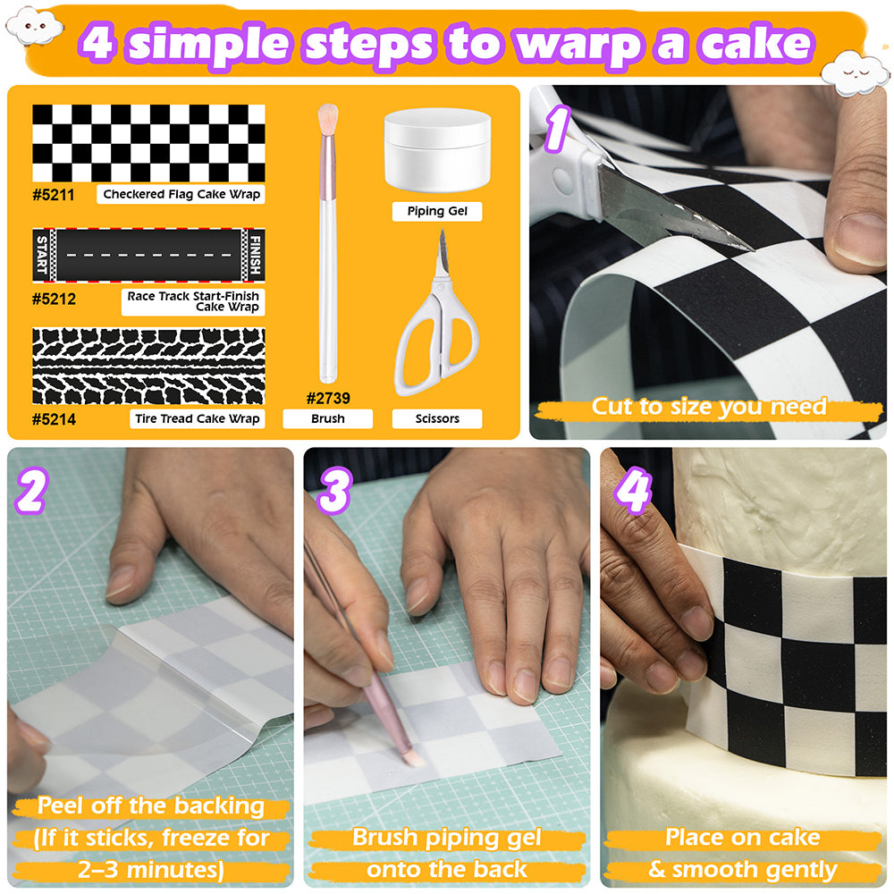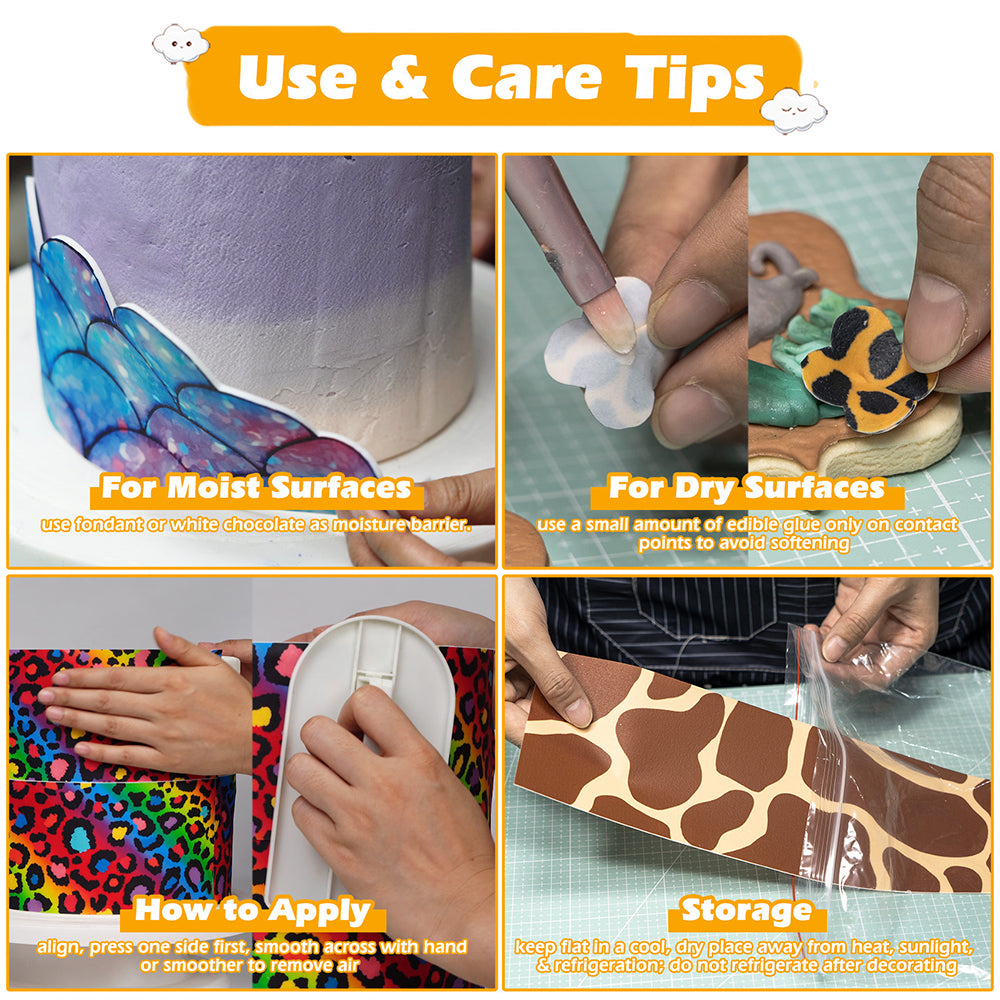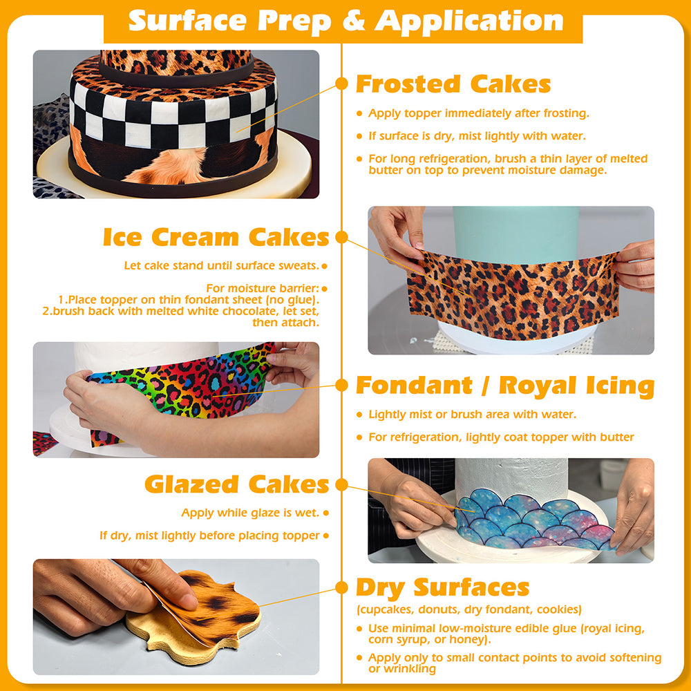 1.For cakes with smooth surfaces: Cut the wrap, peel backing, brush a little edible glue, and stick on fondant. Trim edges with a craft knife. Insert a stick into fondant if needed.