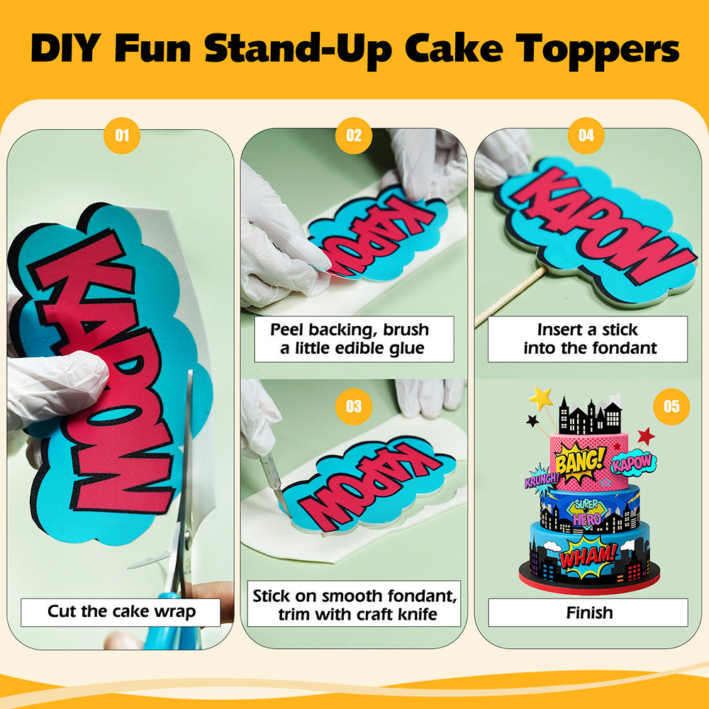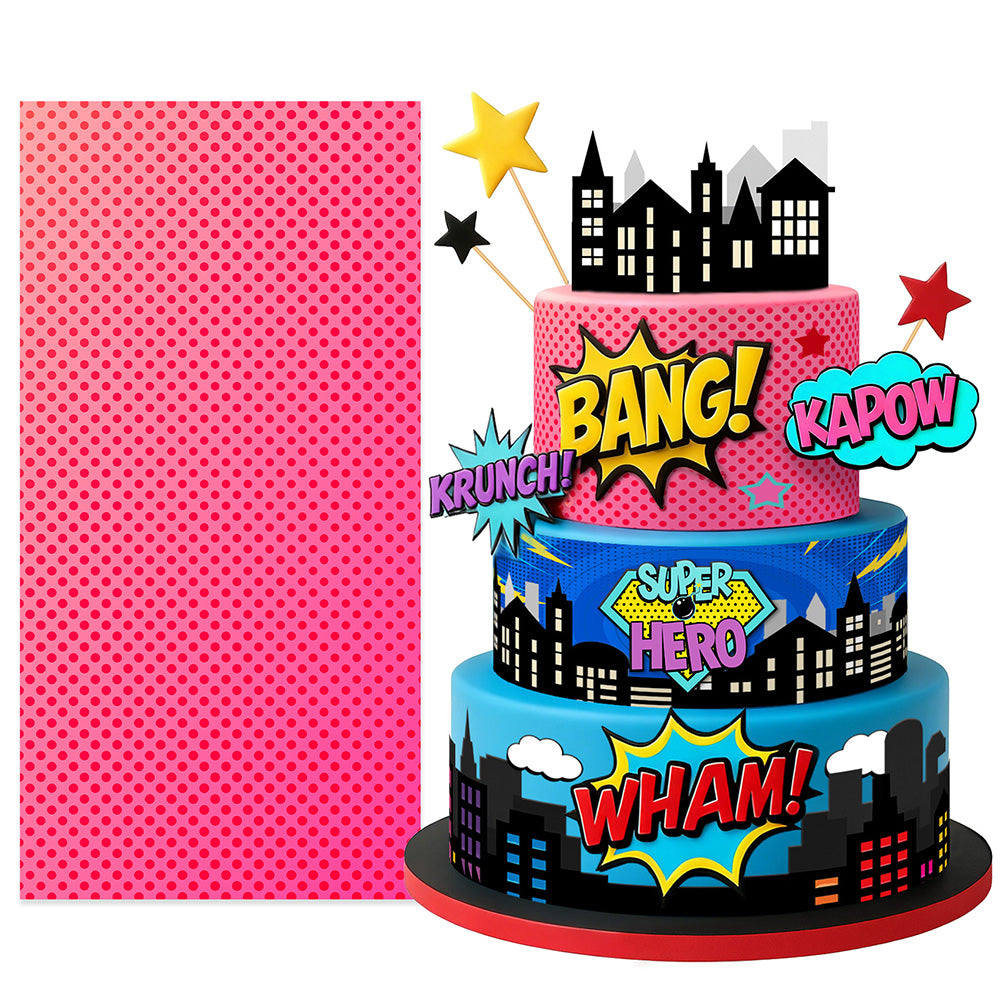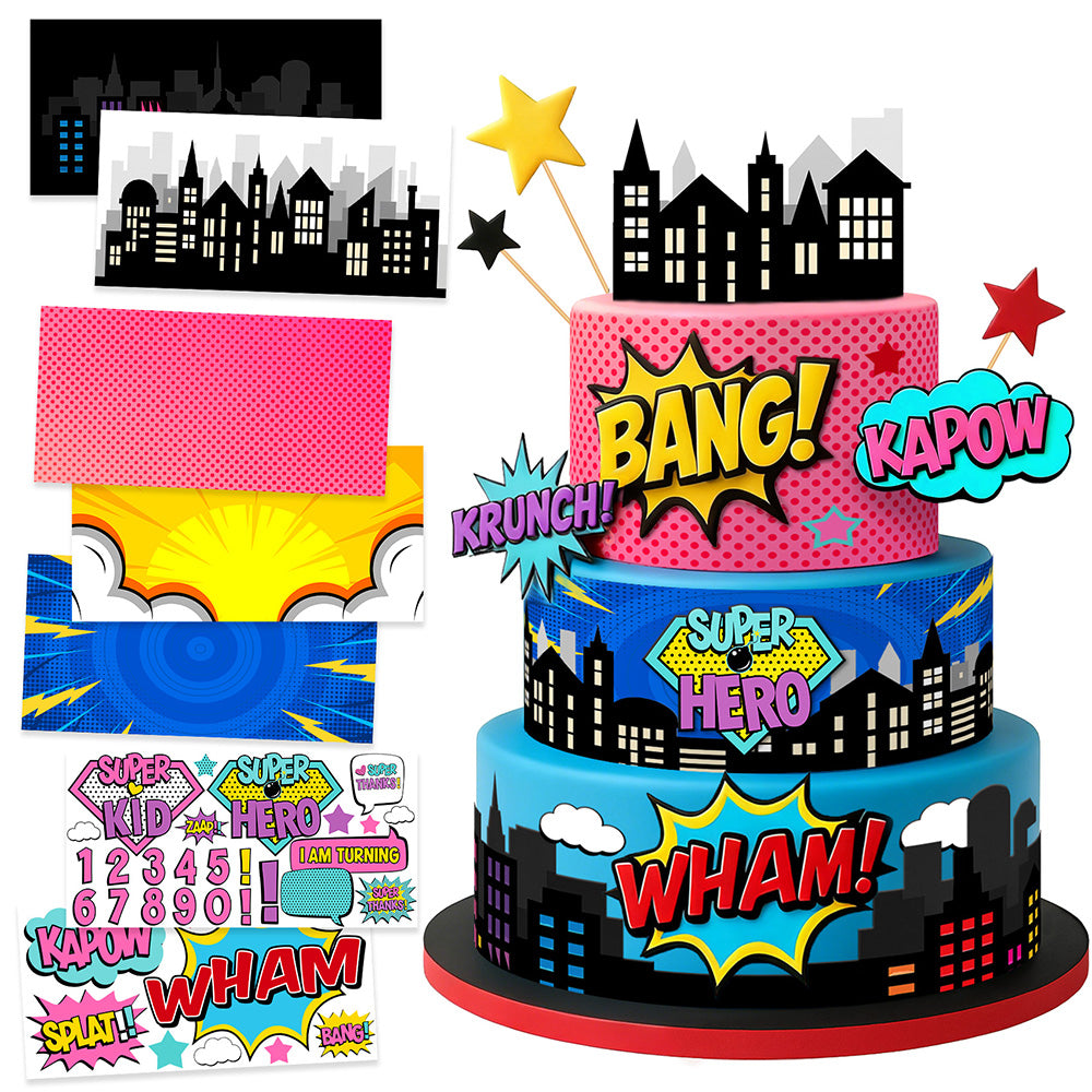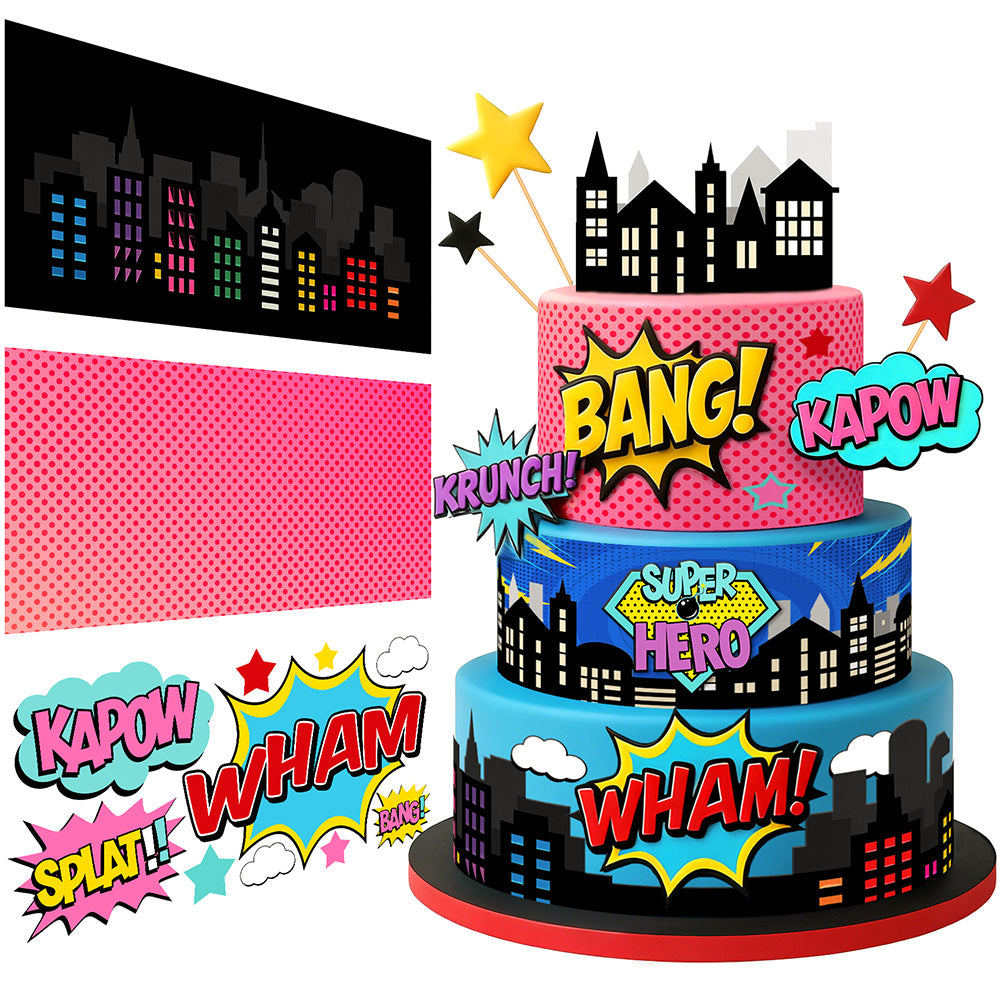 Transform your cakes, cupcakes, and desserts into a superhero cityscape with this fun and edible cake wrap! Perfect for city-themed parties, boys’ and girls’ birthdays, and special occasions.
