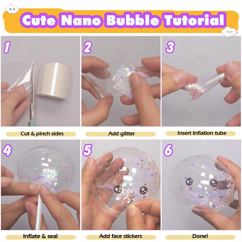 1 kit, endless creativity, craft in a few steps, now you've seen everything: 1) cut nano tape, fill with charms, remove the film, inflate with a straw, seal, then add stickers, air clay sculpting decorations or a hand-drawn kawaii face with creativity for a fun & satisfying toy or keychain 2) DIY stress ball_ just fill with water & glitters to make your own squeeze water ball