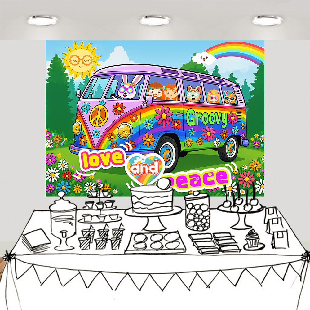 Transport your party to the free-spirited era of the 60s and 70s with a groovy hippie backdrop featuring a colorful retro van, peace sign symbol, daisy flowers, tie-dye rainbow patterns, animal bus graffiti, round sunglasses, headbands, and whimsical cartoon characters with flower ccrowns-capturing the essence of hippie culture, flower power, psychedelic decor, and the iconic peace and love movement to add retro boho vibes and joyful energy to any celebration or photo booth