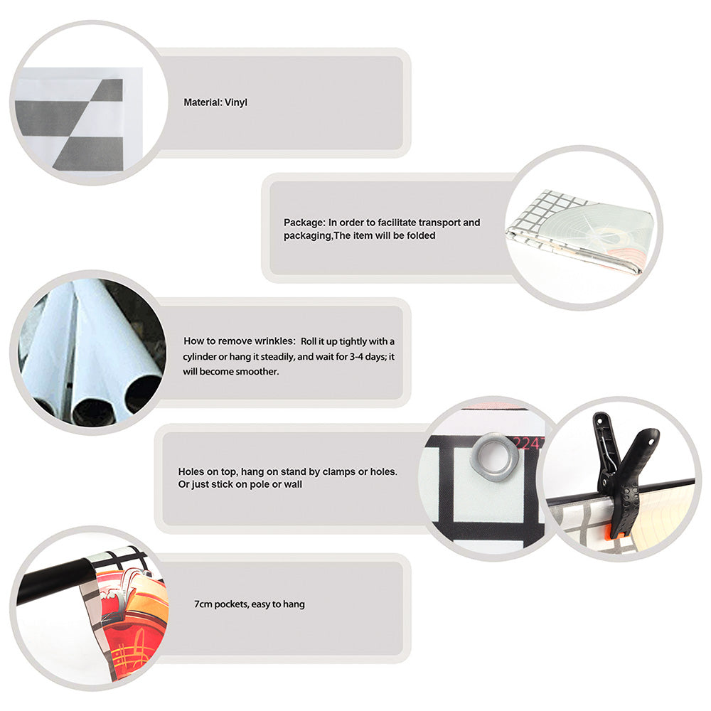Length is 7 feet, height is 5 feet; provide customization; made of vinyl, durable seamless, reuse, not reflective