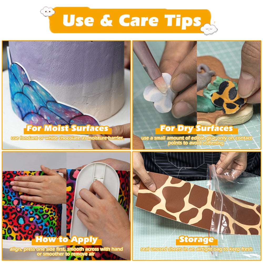 Storage: Keep sealed in a cool, dry place away from sunlight. If refrigerated, store decorated cakes for only a few hours to avoid moisture damage.